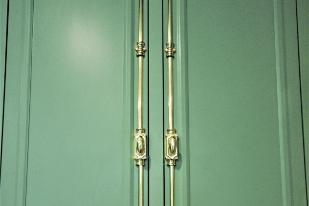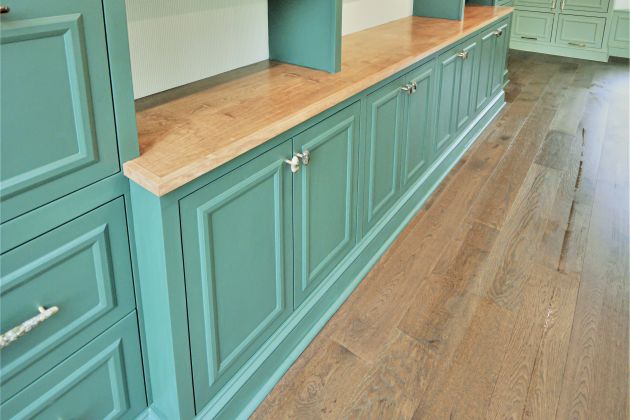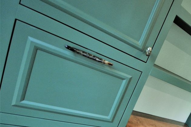 A mix of natural stone & brass hardware compliments the green & woodgrain cabinetry. Handles & knobs match the design & function of the custom cabinetry. For the tall cabinets, dual bar locks allow the doors to store the family’s coats without pushing open. This provides excellent function without sacrificing style.