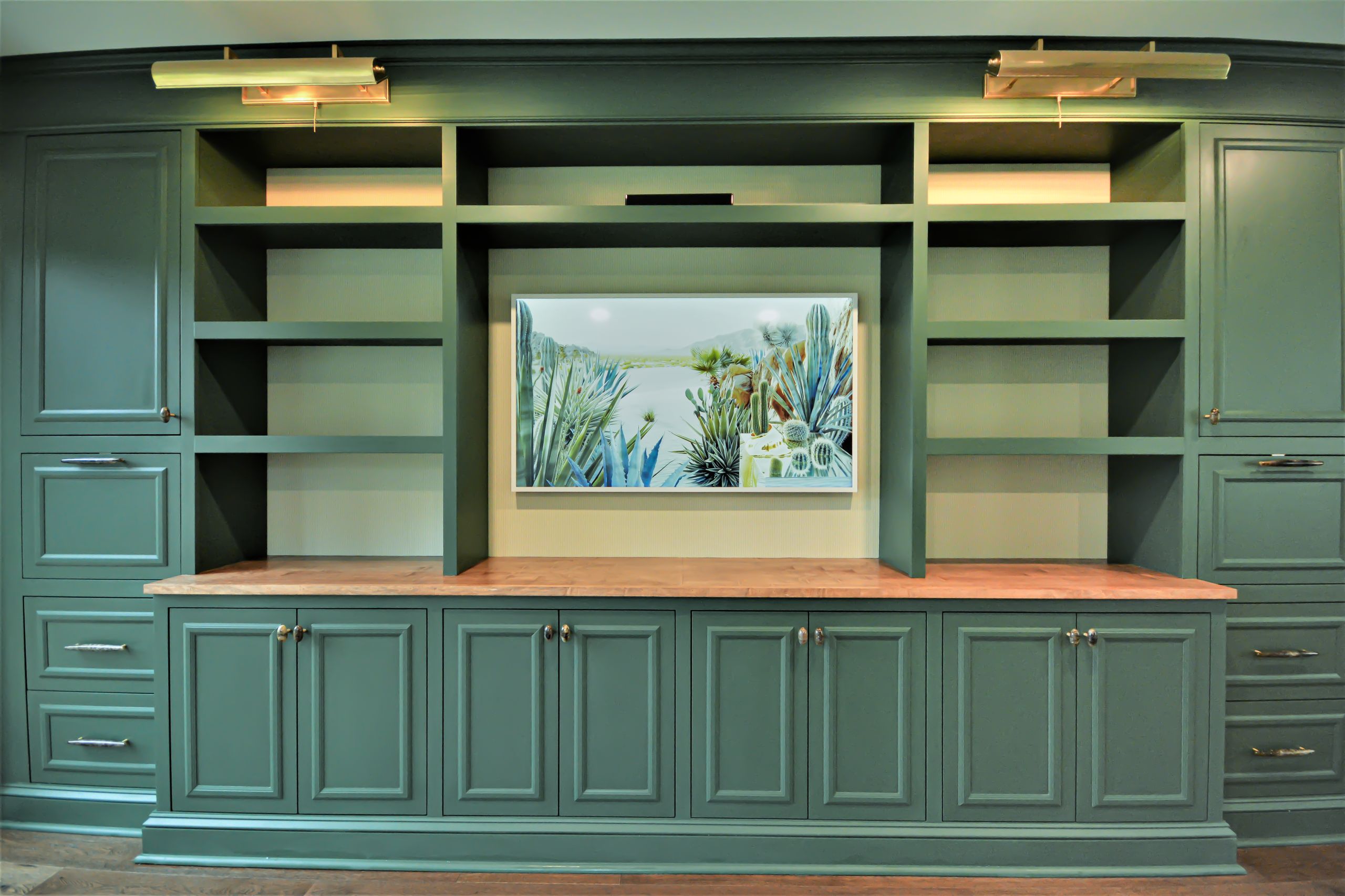 In the center of the custom cabinetry hangs a modern super-flat TV panel, with an auxiliary driver box. When it’s not displaying the kids’ favorite TV shows, it doubles as a piece of fine art. With the clean & minimal frame, nobody would know otherwise!